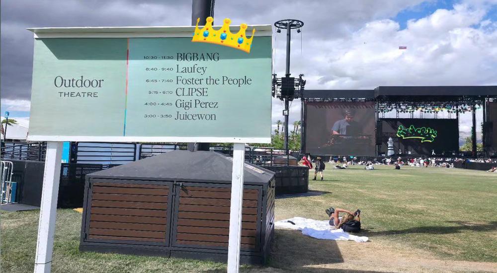 Foto: Jadwal penampilan BIGBANG terpampang di papan lineup panggung Outdoor Theatre pada festival Coachella Valley Music and Arts Festival./X