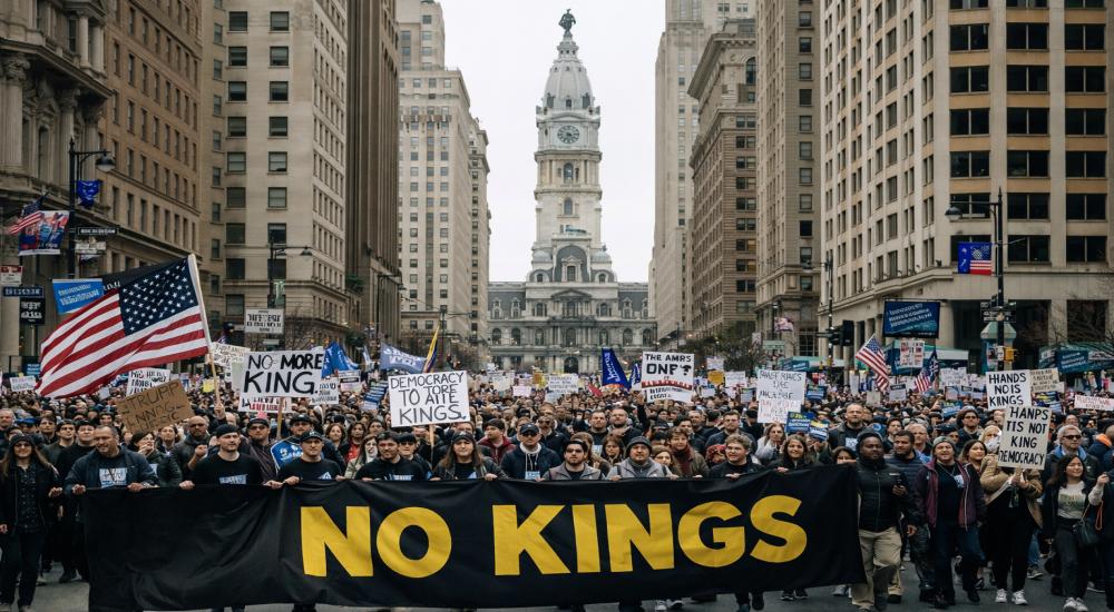 Foto: Ribuan demonstran membawa poster dan bendera saat mengikuti aksi protes “No Kings” yang menentang kebijakan pemerintah di Philadelphia, Amerika Serika