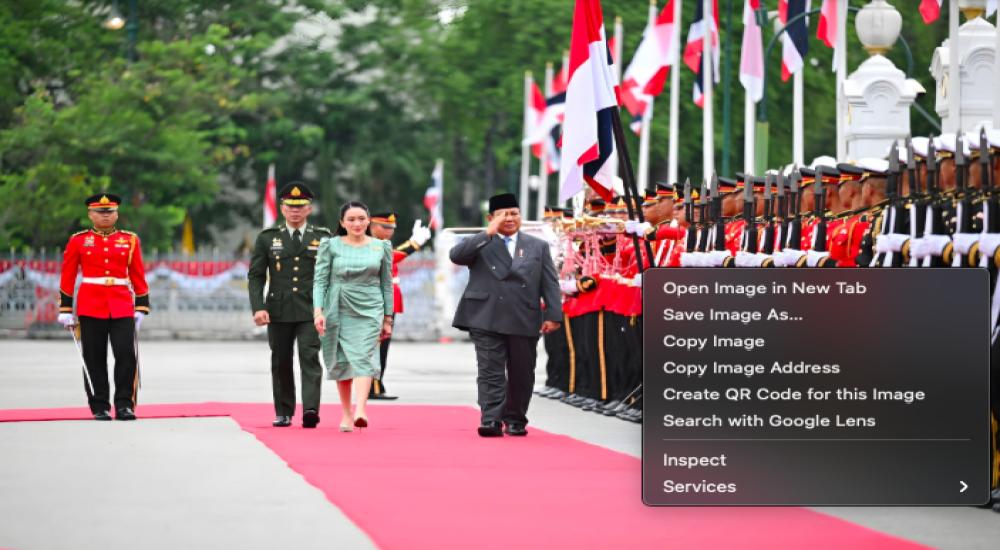 Sesampainya di lokasi pada pukul 10.03 waktu setempat, Prabowo segera menyapa Paetongtarn dengan hangat sebelum mereka berdua berjalan bersama ke podium kehormatan. Prabowo memberikan penghormatan kepada pasukan militer yang berdiri rapi menantikan kedatangannya.