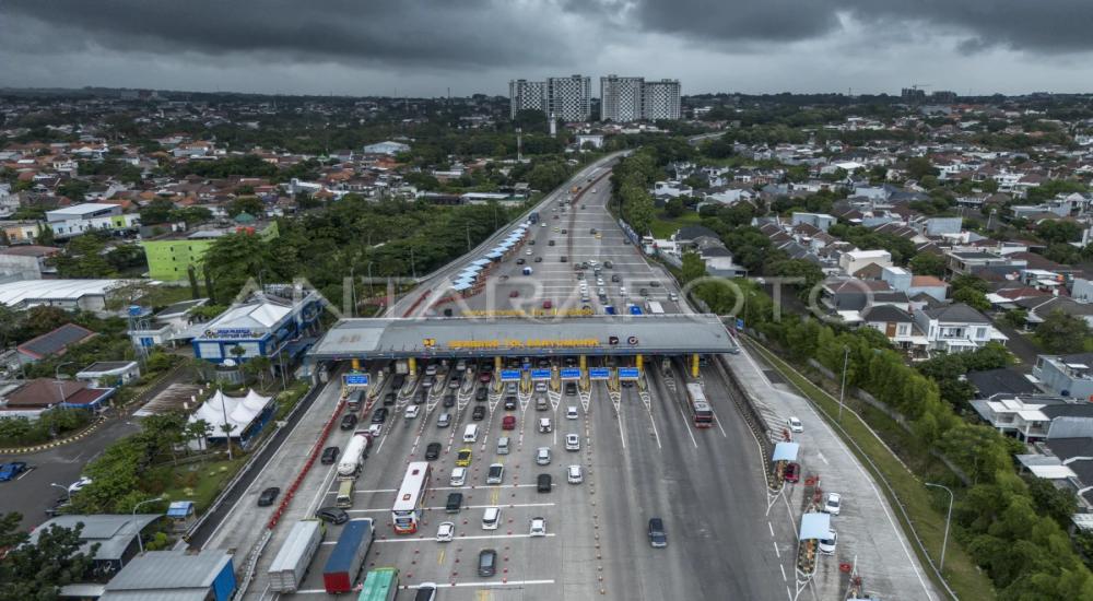 Foto: Foto udara kendaraan menuju arah Jakarta memasuki gerbang tol di jalur Trans Jawa saat arus balik libur panjang. ANTARA FOTO / Aprillio Akbar